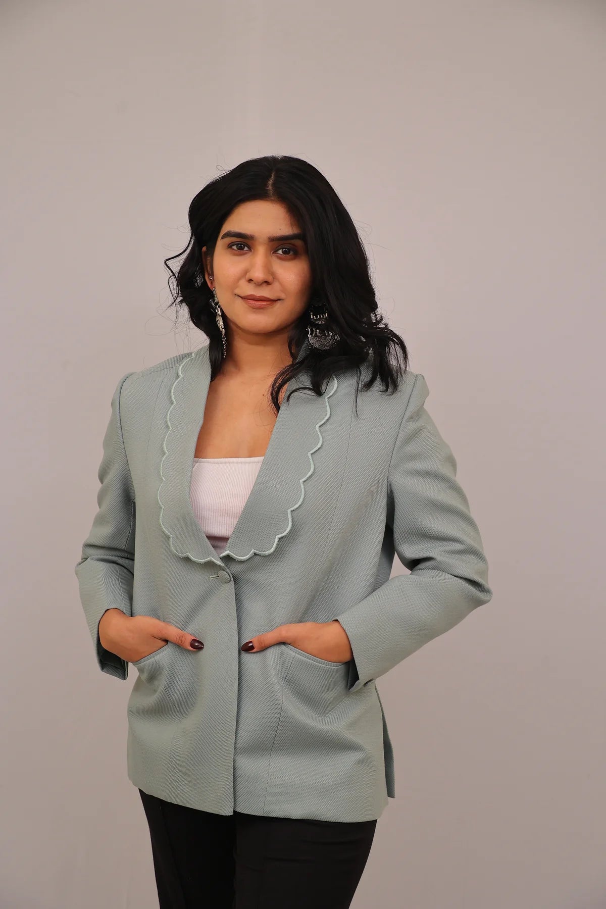 A fresh twist on classic tailoring, The Scallop Edge Blazer in Mint Mist features a soft pastel hue and delicate scalloped lapel detailing that brings a feminine edge to power dressing.